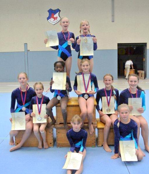 Der Wettkampf fand in zwei Wertungskategorien statt, in der Kategorie Kreisfinale (KF) und der Kategorie Kreisentscheid (KE, d.h. Qualifikation für den Bezirk). Hier konnten sich sechs Turnerinnen aus dem TuS Glarum das begehrte „Ticket“ erturnen. Hanna Merkel und Marlene Weinstock dürfen am 22. September nach Aurich, Lena Merkel, Annika Neumann, Sarah Becker und Wenke Reents nach Schortens reisen, um dort unseren Verein, aber letztlich auch den Turnkreis Friesland auf Bezirksebene zu vertreten, allerdings dann gegen Konkurrentinnen aus dem gesamten Bezirksgebiet Weser – Ems. Sie belegten in ihren Wettkampfklassen dreimal den 1. Platz (Hanna, Lena und Marlene) und einmal den zweiten (Annika), den dritten (Wenke), und den fünften (Sarah). Auch in den Kreisfinals glänzten die Glarumer mit ihren Ergebnissen. So kamen Nele Reents, Xenia Schundelmeier, Brigit Zumdick und Joy Oeltermann auf das Treppchen und empfingen die ersehnten Medaillen. Luisa Thomßen schrammte knapp am Podest vorbei und wurde Vierte.