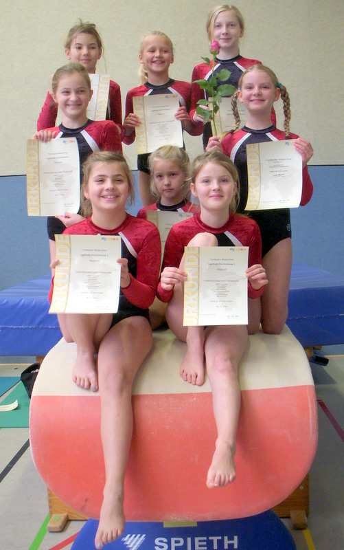Am 09. November hatten Frieslands Turnerinnen wieder Gelegenheit, ihre turnerischen Fähigkeiten im Leistungsvergleich mit anderen Vereinen aus dem gesamten Gebiet der Turnbezirkes Weser-Ems unter Beweis zu stellen. Sie mussten die Rückrunde im Rahmen des Abschlusses der Ligawettkämpfe bestreiten. Die Hinrunde fand bereits im Juni in Wildeshausen statt. Aus dieser kehrten damals die Turnerinnen der Turngemeinschaft (TG) Friesland, unterteilt in verschiedene Wettkampfklassen, mit unterschiedlichen „Kontoständen“ zurück. Nun kam die Chance, ihre Punkte mit dem zweiten Wettkampf zu verbessern. Koordinator der TG Friesland, Reinhard Milter war im Vorfeld zuversichtlich:“ Wir gehen gut vorbereitet in diese Rückrunde und haben die Absicht, Plätze nach oben gutzumachen.“ Die Mannschaft in der Leistungsstufe P5 befand sich auf Platz 5 (von 12) und das Team der Stufe P6 lag auf Rang 7 von 13. Nach Durchführung der Rückrunde werden dann die Punkte addiert und eine neue Rangliste erstellt. Punkt 10:00 Uhr am Samstagmorgen war es dann soweit. In der gut ausgestatteten Sporthalle des TuS Oestringen konnten die Wettkämpfe beginnen. Die 1. Vorsitzende des TuS Oestringen Ute Müller durfte insgesamt 116 Turnerinnen aus 15 Vereinen bzw Turngemeinschaften begrüßen. Unmittelbar danach begaben sich 58 Turnerinnen der Wettkampfklasse P6 und exakt ebenso viele in der Klasse P5 hoch motiviert und konzentriert an die Standardgeräte der Frauen – Sprung, Reck/Stufenbarren, Balken und Boden. In der Wettkampfklasse der Stufe 5 wurden die Turnerinnen der TG Friesland Lena Merkel, Annika Neumann (Glarum), Amy Gerhardt (Sillenstede), Carlotta Marahrens, Luisa Fust und Paula Koopmann(Oestringen) ergänzt durch Ylva Conerus (Sillenstede) und Melina Pelka (Jever). Das Team schlug sich tapfer an den Geräten, doch am Ende des Wettkampfes hieß es: Beibehalten des fünften Ranges – kein Treppchenplatz erreicht. Milter betonte: “Die Konkurrenz hat auch nicht geschlafen und war zu stark. Die namhaften Vereine wie Bramsche, Aurich, Nordhorn oder Hage sind nur schwer zu „knacken“. Dafür gelang den Friesländerinnen aber der eine oder andere Coup in der Geräteeinzelwertung. Ylva Conerus lieferte einen sauberen Sprung und landete im Gesamtfeld der 58 Starterinnen auf Platz 9. Am Reck erreichten Lena Merkel, Luisa Fust und Carlotta Marahrens Plätze im oberen Drittel. Darüber hinaus konnte Merkel den grandiosen ersten Platz mit der Tagesbestnote von 14,200 Punkten (von 15 möglichen) am Balken belegen und bekam dafür bei der Siegerehrung eine Rose überreicht. Kurz hinter Merkel konnten sich ihre Teamkolleginnen Carlotta Marahrens und Luisa Fust einreihen und die Plätze 4 und 13 belegen. Milter: „Auch wenn die Teamwertung keine Steigerung erbracht hat – die Einzelergebnisse können sich sehen lassen.“ In der Klasse der Stufe P6 musste die Mannschaft gesundheitsbedingt auf zwei Leistungsträgerinnen verzichten. Es fehlten Marlene Weinstock und Wenke Reents (Glarum), dafür verstärkte Hannah Hebell (Oestringen) das Team. Auch hier hieß es: antreten und alles geben. Aber nicht verwunderlich - dieses Team konnte sich nicht verbessern und fiel schlussendlich auf Platz 10 zurück. Am Sprung konnten sowohl Hannah Hebell und Hannah Merkel hervorragende Überschläge zeigen und damit die Plätze 7 und 10 ergattern. Merkel legte am Stufenbarren eine der besten Übungen hin. Leider wurde ihr ein Element nicht anerkannt und ihr fehlten zur Tagesbestnote wertvolle Punkte. Ein Resümee von Frieslands Kreisfachwart Gerätturnen, Reinhard Milter: „So ist Wettkampf im Gerätturnen: die Tagesform und das Quäntchen Glück entscheiden mit. Schon in 14 Tagen, am 23. November geht es weiter. Dann müssen dir Turnerinnen, die eben noch gemeinsam in der TG Friesland geturnt haben, dann wieder für ihre Stammvereine antreten - im Kampf um den Friesland-Pokal.