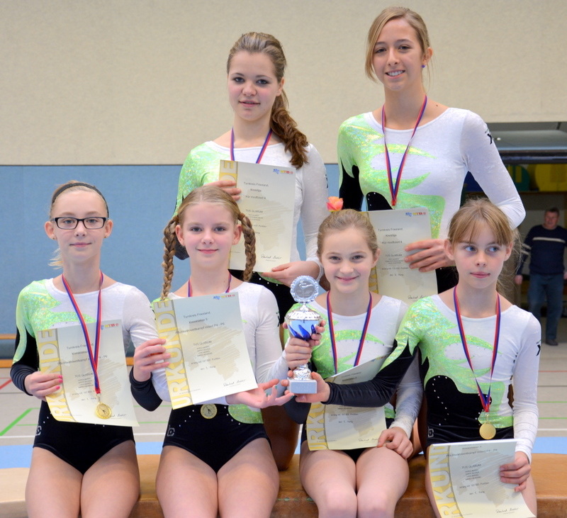 In der Kreisklasse 5 gab es ein buntes Bild an Mannschaften. Hier tummelten sich immerhin 5 Mannschaften aus vier Vereinen und kämpften um die Meisterschaft in dieser Klasse. Die Mannschaft des Heidmühler FC belegte mit 143,20 Punkten Platz 5. Der TuS Sillenstede entsendete gleich zwei Teams in diese Klasse. Während das Team Sillenstede 1 mit 150,65 Zählern Platz 4 erreichen konnte, schaffte es die Gruppe Sillenstede 2 auf das Treppchen und belegte mit 160,15 Punkten Rang 3. An der Spitze wurde es nun richtig eng. Die Mannschaften des TuS Glarum und des TuS Oestringen lagen während des Durchlaufes permanent Kopf an Kopf und lieferten sich ein spannendes Duell, welches schlussendlich die Equipe des TuS Glarum für sich entscheiden konnte. Mit einem Konto von 167,60 Punkten lag sie am Ende mit 25 Hundertstel sehr knapp vor dem TuS Oestringen (167,35 Punkte). Die Turnerinnen dieser Mannschaft konnten auch mit hervorragenden Einzelergebnissen glänzen. So belegte Hanna Merkel sowohl in der Gesamtwertung, aber auch in der Geräteeinzelwertung an allen Geräten den ersten Platz. Ihre Schwester Lena wurde in der Gesamtwertung Dritte und am Reck ebenfalls Dritte. Sarah Becker konnte am Boden die drittbeste Wertung erzielen.