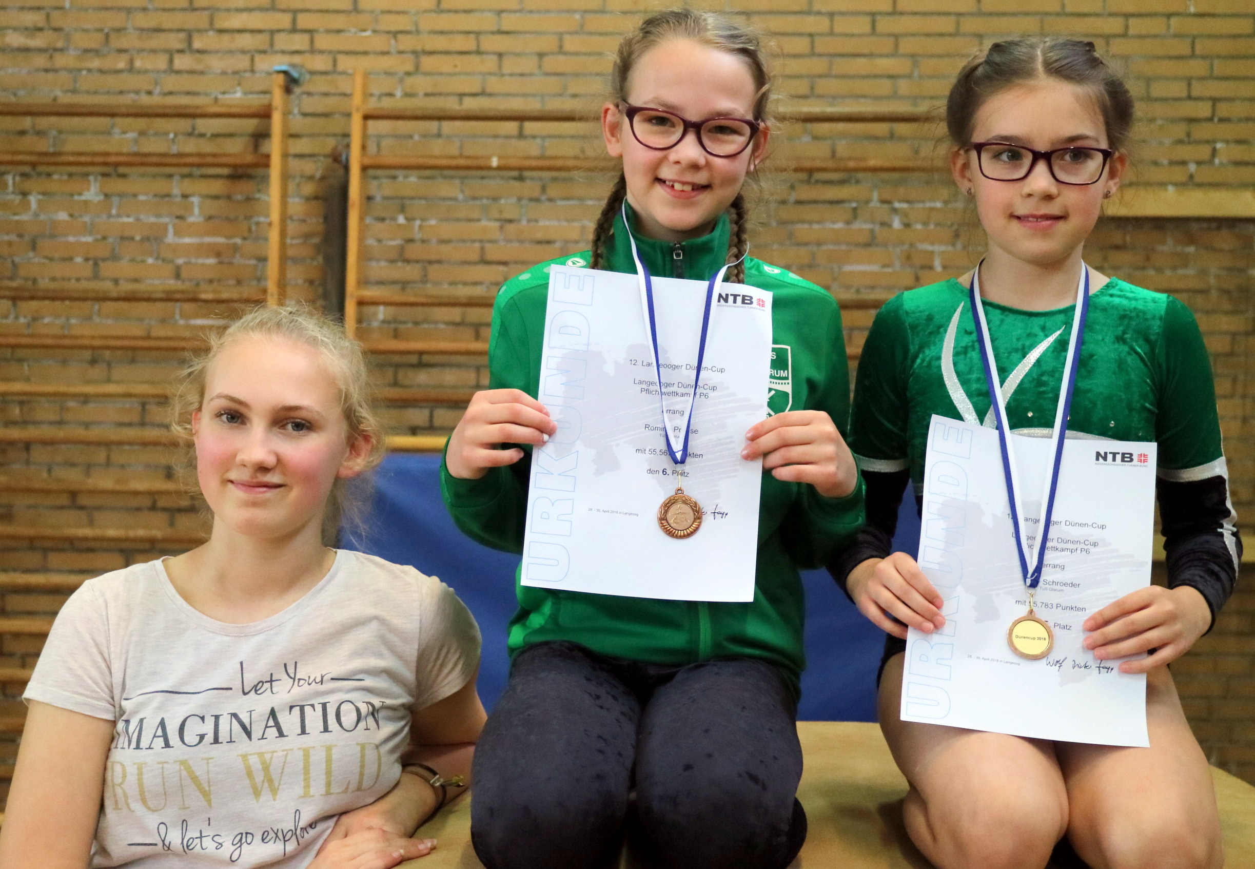 Eine kleine Delegation des TuS Glarum (die beiden Turnerinnen Amy Schroeder und Romina Prause, Betreuerin Raja Schroeder und Trainer / Kampfrichter Reinhard Milter) machten sich auf den Weg, um auf der schönen Insel an der 12. Auflage des Langeooger Dünen Cups teilzunehmen. Der Langeooger Dünen Cup ist ein Turnwettkampf in einer sehr kleinen Halle, der einzige auf einer niedersächsischen Insel und beliebt bei Vereinen aus ganz Niedersachsen und Hamburg. Entsprechend stark ist die angetretene Konkurrenz. Auf dem Einsatzplan standen im ersten Durchgang die Pflichtwettkämpfe der Leistungsstufe 6 der jüngeren Turnerinnen (Jahrgang 2008 und Jahrgang 2009/2010). In einem starken Teilnehmerinnenfeld von 17 jungen Aktiven hatte Romina Prause (2008) „alle Hände voll“ zu tun, um sich gegen ihre Konkurrentinnen durchzusetzen. Und es gelang ihr ganz hervorragend. Konzentriert präsentierte sie sich den Kampfrichtern und stellte ihre Übungen vor. Gleich am ersten Gerät, dem Boden, ließ sie ihre Mitstreiterinnen zurück und erreichte die zweitbeste Einzelnote. Auch der Sprung „lief“ gut. Eine tolle Wertung von 14,70 Punkten von 16 möglichen bedeutete an diesem Gerät Platz 5 im Einzelklassement. Am Balken verhinderte leider ein Runterfaller die drittbeste Einzelwertung. Am Ende des Tages erreichte Prause einen guten sechsten Platz in einem engen Ergebnisfeld.