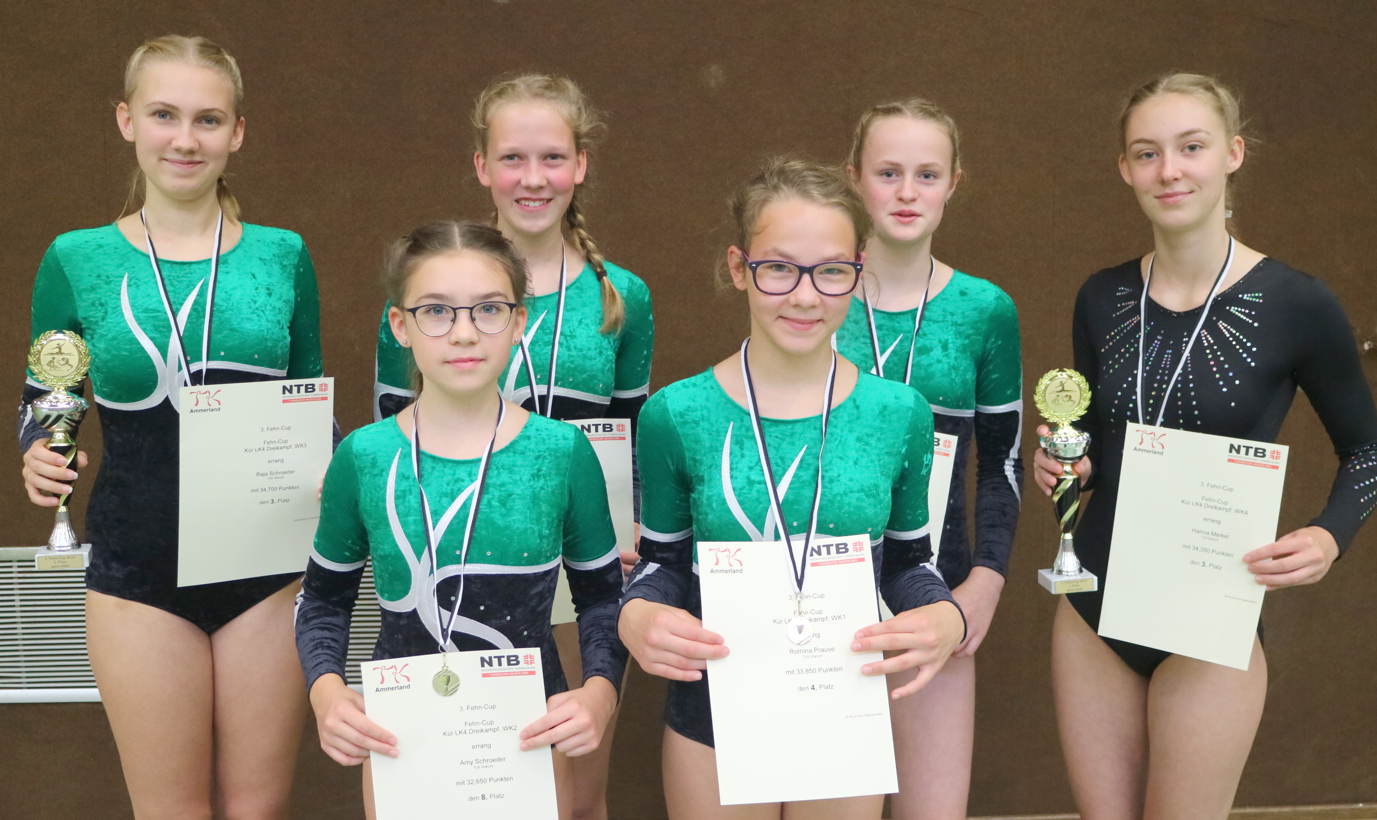 In der Wettkampfklasse 3 (Jahrgänge 2004 / 2005, 18 Athletinnen) zeigten die beiden startenden Glarumerinnen Raja Schroeder und Amke Harms ein gemischtes Leistungsbild. Raja Schroeder, Kreismeisterin ihrer Klasse des Vortages, fand ihre Wertungen vom vorangegangenen Wettkampf bestätigt, konnte sie doch am Potential ihrer „eingeübten“ Küren festhalten. Sie zeigte den zweitbesten Sprung, die drittbeste Balken- und Bodenkür. Diese war gespickt mit hochwertigen gymnastischen und akrobatischen Elementen und erhielt die beste Ausgangsnote aller am Wettkampf vertretenen Turnerinnen. Am Ende des Tages durfte Schroeder den hochverdienten dritten Podestplatz besteigen. Harms hingegen war etwas vom Pech verfolgt. Sie musste kurzfristig ihre Bodenübung umstellen und erlitt einen Sturz am Barren. Beides kostete wertvolle Punkte und katapultierte sie auf Platz 15.
