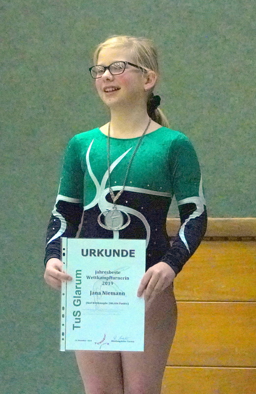 Die Turnabteilung des TuS Glarum gestaltete gleichzeitig die diesjährige Ausgabe von insgesamt 21 Gerätturnabzeichen (für 19 Vereinsturnerinnen und zwei Gastturnerinnen vom benachbarten TuS Sillenstede) sowie die Ausgabe der Medaille für die jahresbeste Wettkampfturnerin.