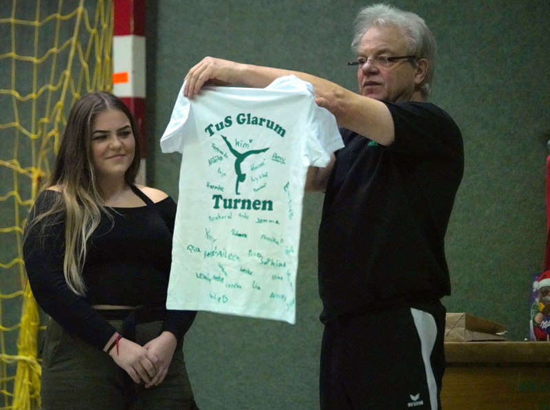 Der Abteilungsleiter der Turnabteilung Reinhard Milter konnte die Kulisse der Veranstaltung nutzen, um eine seit vielen Jahren aktive Turnerin und ehrenamtlich Engagierte zu verabschieden. Bianca Mülder, Turnerin seit ihrem fünften Lebensjahr und nun seit 13 Jahren im TuS aktiv, zuletzt als Sportassistentin und engagierte Kampfrichterin im Gerätturnen, wird mit Jahresbegin 2020 eine berufliche Ausbildung beginnen und den Bereich Schortens zunächst verlassen. Zum Abschied erhielt sie ein T-Shirt mit allen Unterschriften der Turnerinnen und Trainer*innen.