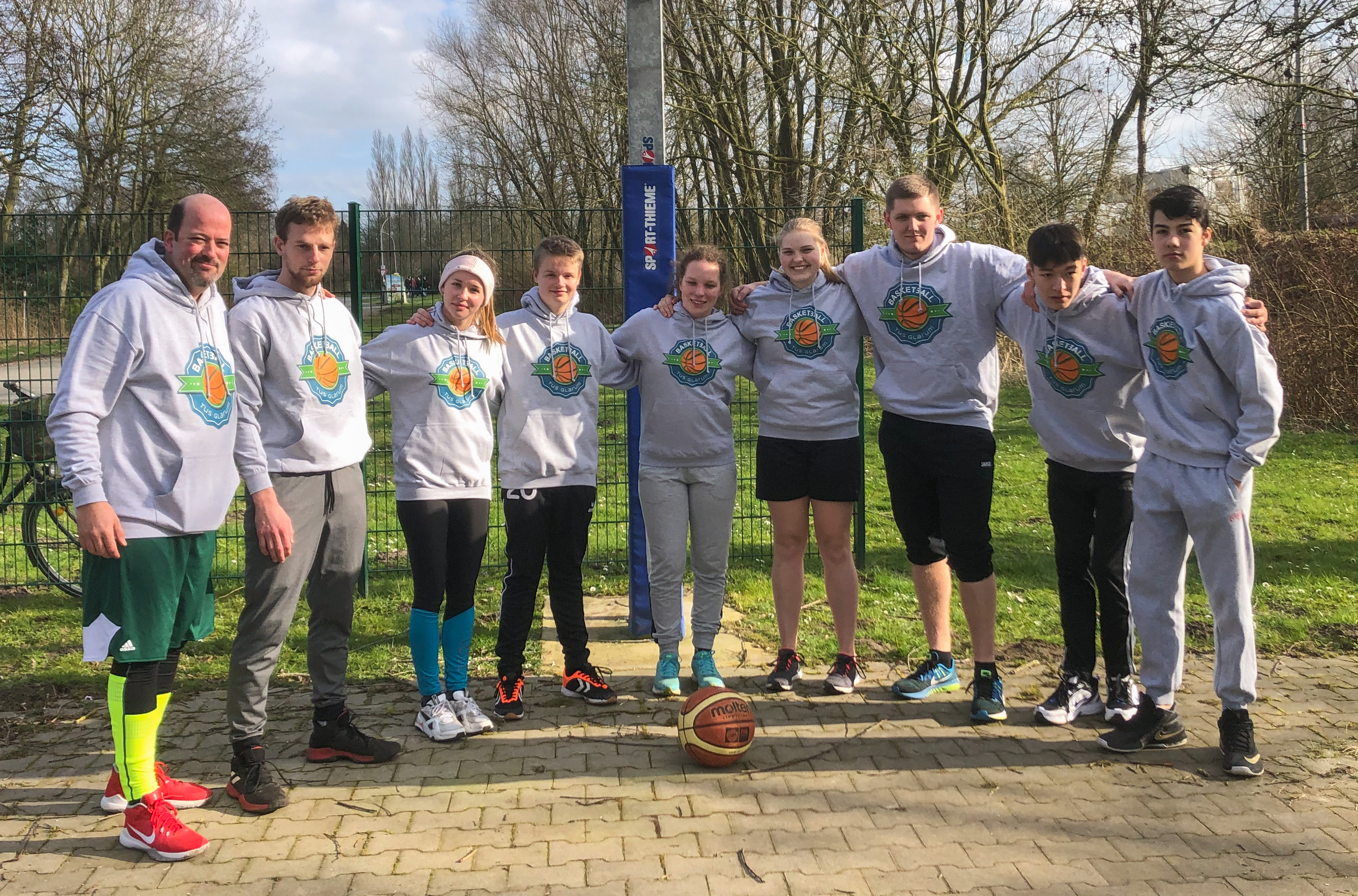 Diese kamen noch rechtzeitig vor der Bekanntgabe der Hallenschließung an, sodass die Basketballer*innen bei schönstem Frühlingswetter auf dem Freiplatz die Hoodies einweihen konnten.