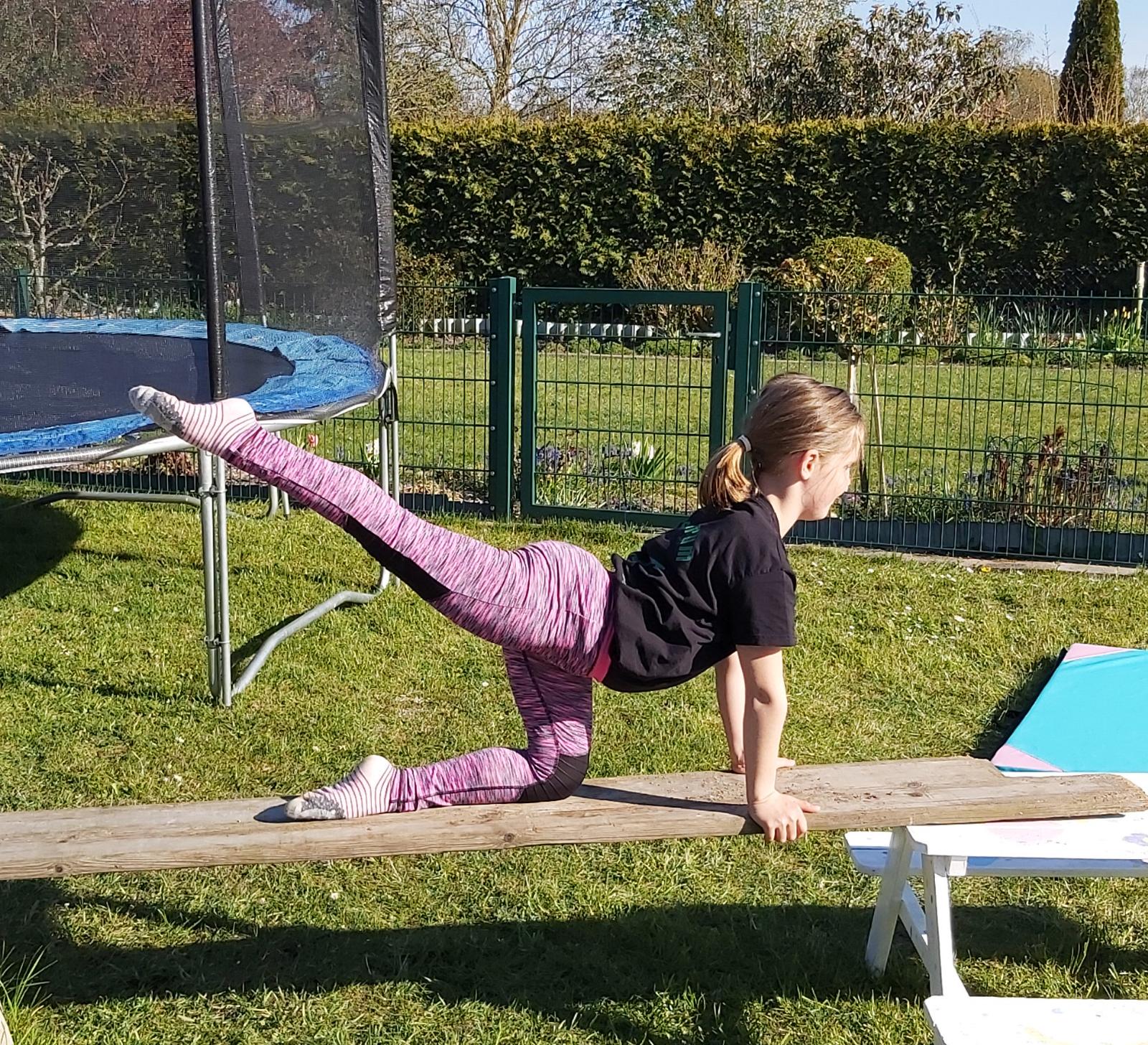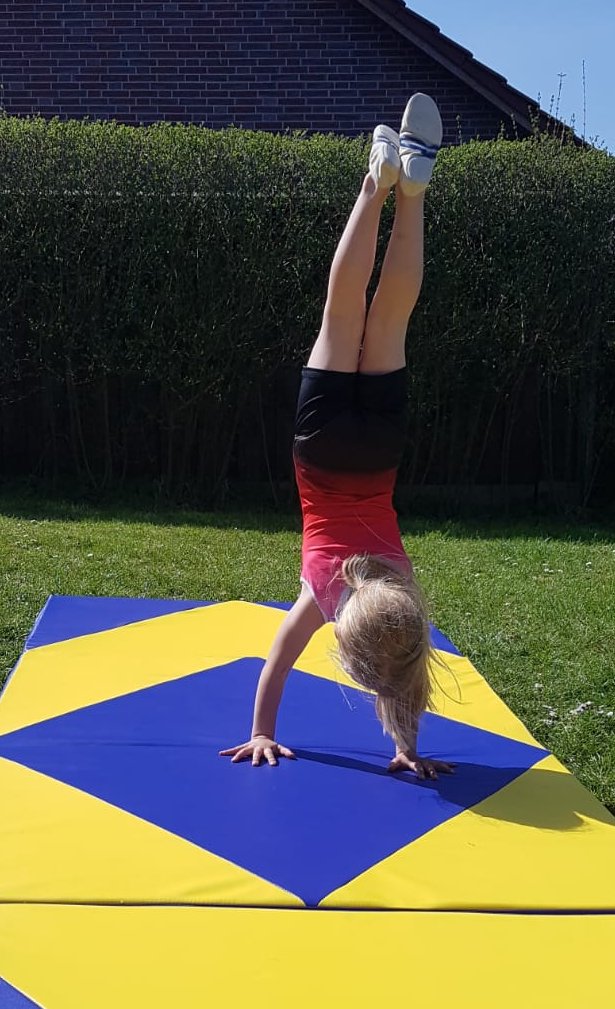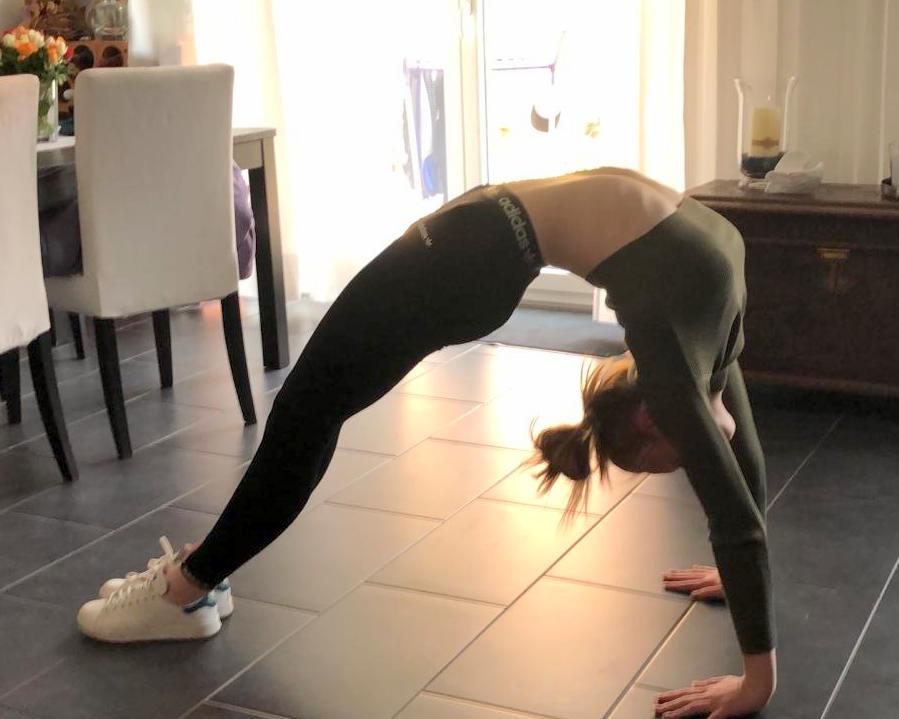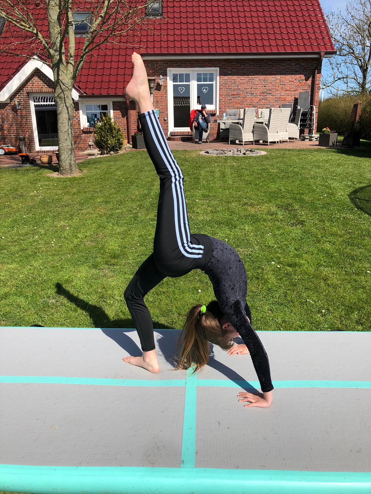Seit Schließung der Turnhallen Mitte März leiden alle aktiven Gruppen der hiesigen Sportvereine an den Entzugserscheinungen durch den „gefühlt“ verordneten Verzicht an gemeinsamer Vereinsaktivität. Wohl dem, der auch in solchen Situationen auf „Individualbetrieb“ umschalten und sich sportlich zu Hause betätigen kann. Die Turnerinnen des TuS Glarum sind da sehr aktiv und vor allem kreativ. Ein kleines Sportprogramm geht immer. Nach den 2-3 täglich wechselnden, per Whatsapp durchgegebenen „Vorgaben“ ihrer Trainerin Marlene Weinstock finden sich Möglichkeiten, im Haus oder ums Haus herum, sich turnerisch etwas auszutoben. Der heimische Rasen wird unter Zuhilfenahme von eigenen kleinen Turnmatten zu einer Bodenfläche, des Öfteren stehen auch kleine AIRTRACKS, Trampoline, Turnstangen und sogar Schwebebalken zur Verfügung. Abteilungsleiter und Trainer Reinhard Milter: „Wichtig ist die regelmäßige Muskelerwärmung, Kraft- und Haltungstraining sowie das Beibehalten der Dehn- und Bewegungsfähigkeit. Wenn dann auch noch ein klein wenig Technikschulung möglich ist, z.B. bei Drehungen und Sprüngen, ist das die halbe Miete. Wenn dann irgendwann das Vereinstraining wieder möglich sein wird, sollen die Turnerinnen nicht bei Stand Null beginnen müssen. Ich weiß, dass sich alle nichts sehnlicher herbeiwünschen als das gemeinsame Training, den Spaß an der gemeinsamen turnerischen Bewegung und die Vorfreude auf kommende Wettkämpfe, wann immer sie sein mögen“.