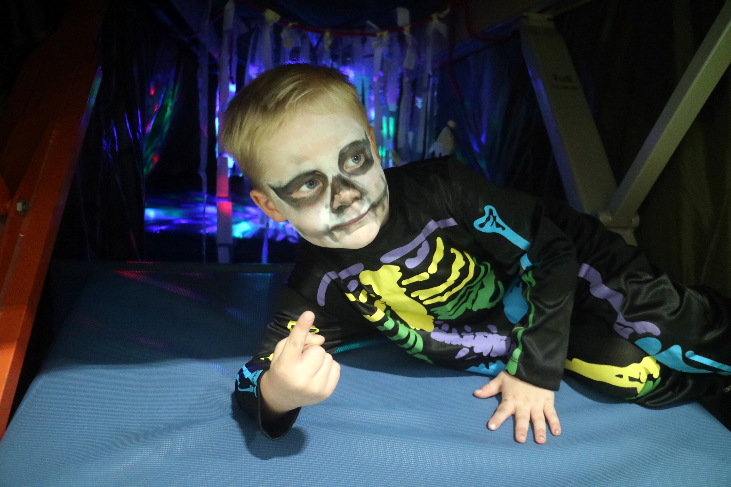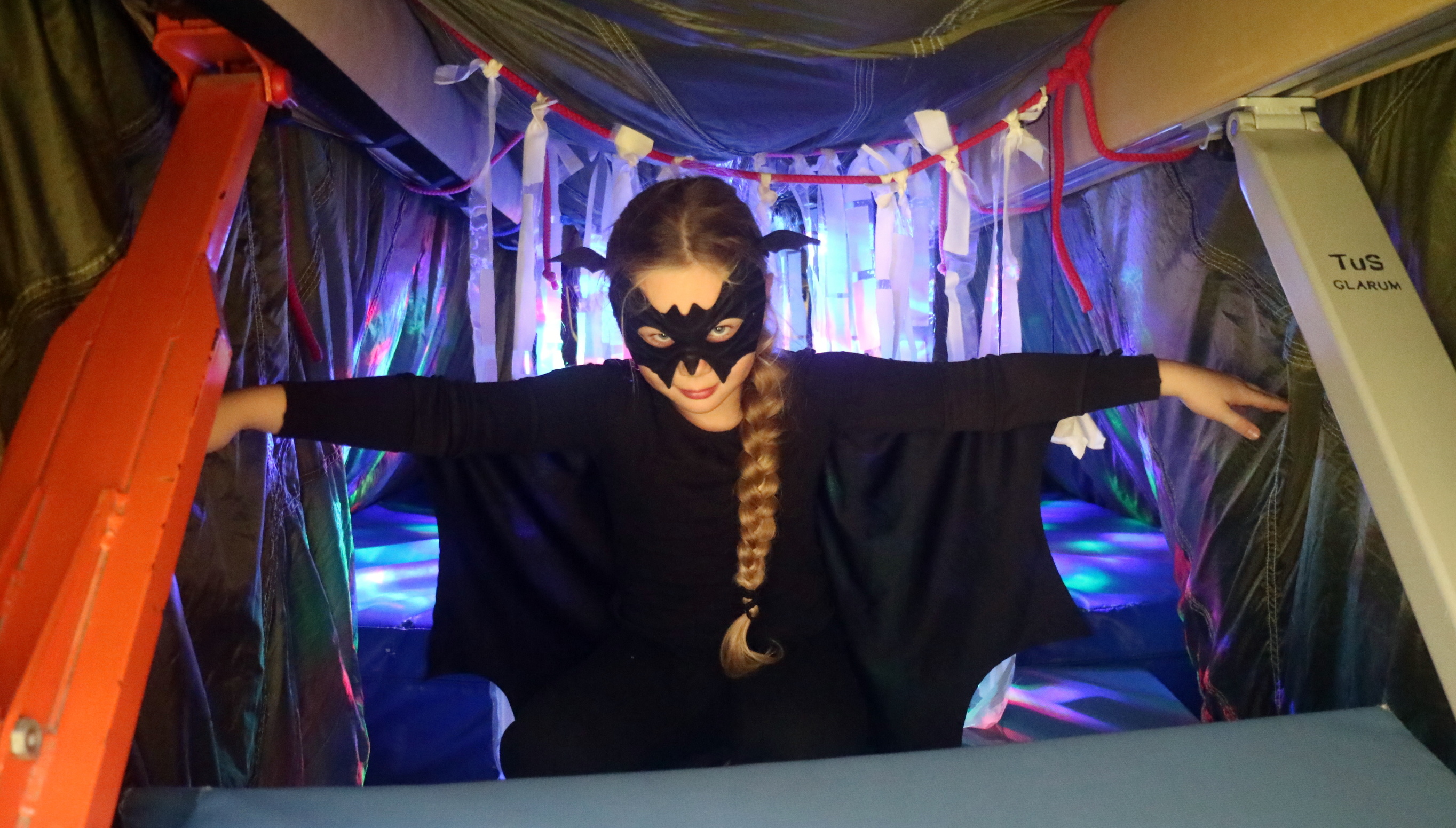 Durch eine gespenstig gruseligen Eingangstunnel konnte die Bahn von allen Geistern und Horrorgestalten betreten werden – natürlich nicht ohne ausdrücklich auf die möglichen lauernden Gefahren und furchtbaren Anblicke hinter dem Eingangsportal gewarnt zu werden! Allen Warnungen zum Trotz durchquerten alle mutig, geschickt und furchtlos die von den vielen Helfern liebevoll aufgebaut und gruselig geschmückten Bewegungsstationen.