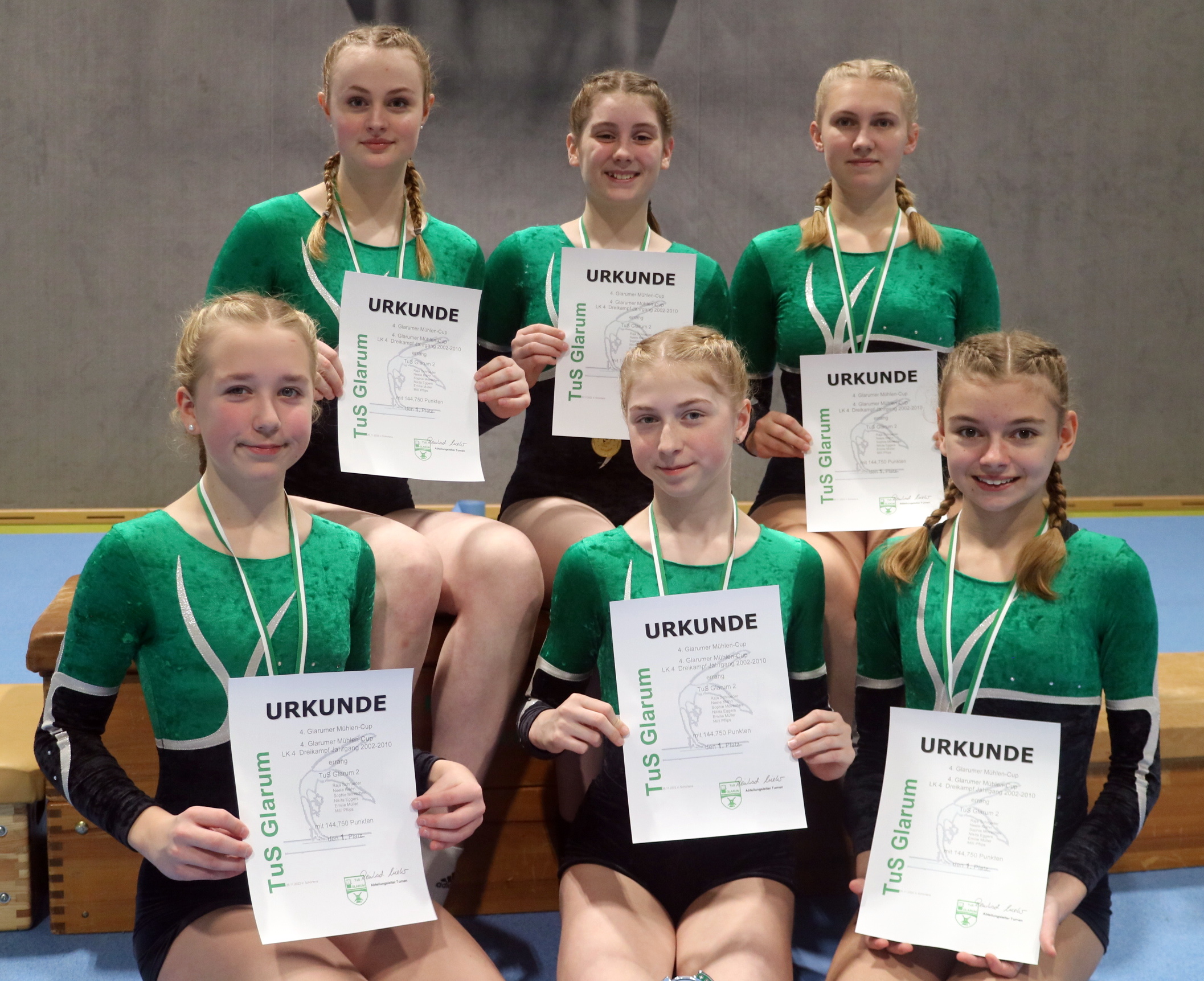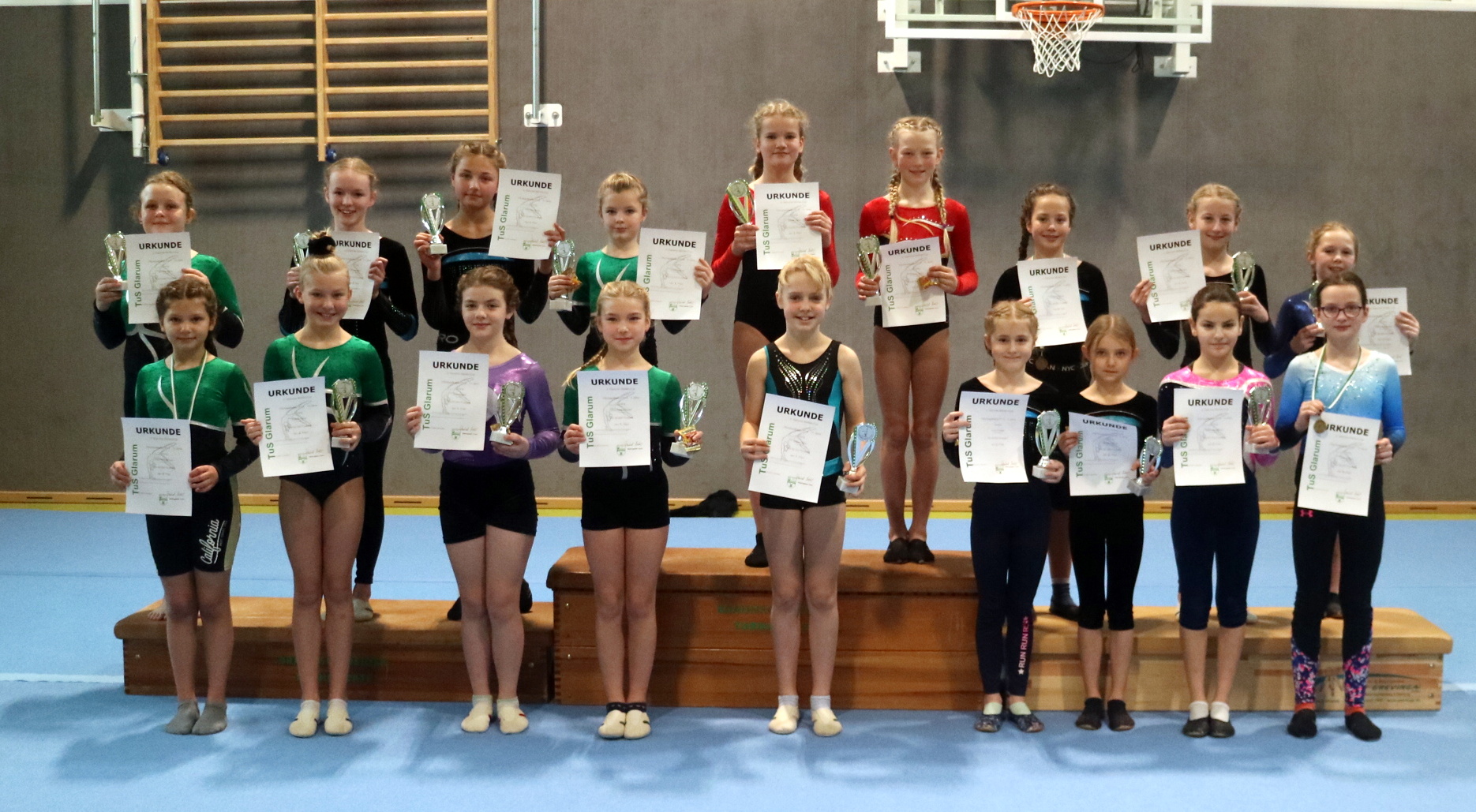 Der Gastgeber TuS Glarum um Organisator Reinhard Milter schickte im ersten Durchgang sieben Turnerinnen an den Einzelstart. Im Wahlwettkampf P1-P6 Jahrgang 2014 trat Zoey Müller gegen zwei starke Konkurrentinnen aus Oestringen an. Am Ende konnte sie mit Bestnoten an allen vier Geräten überzeugen und holte sich den Sieg. Auch Lea Filipczyk, die im Jahrgang 2013 gegen drei Talente aus Oestringen antrat, konnte sich trotz eines Sturzes am Boden behaupten und gewann verdient den Siegerpokal.