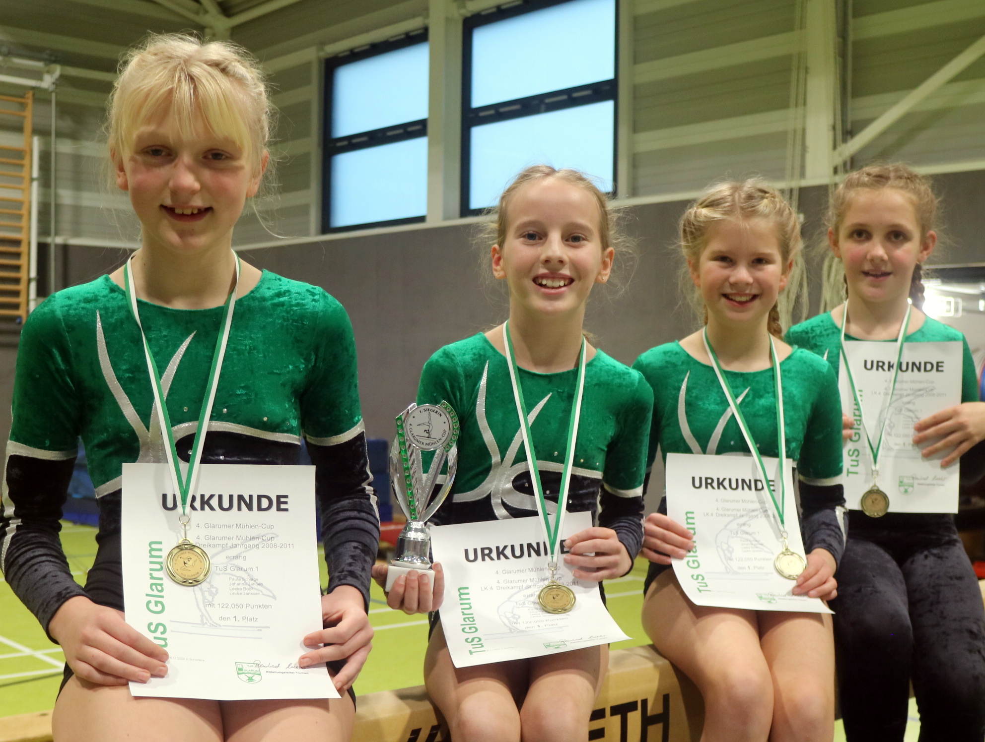 „In der Mannschaftswertung erhöhte sich das turnerische Niveau, die Kür stand auf dem Plan“, erläuterte Milter. Im Altersband 2008 bis 2011 turnten die Gastgeber als TuS Glarum II mit Leeke Böök, Johanna Janßen, Levke Janssen und Paula Schlage konkurrenzlos. „Sie konnten aber dennoch wertvolle Erfahrung sammeln“, betonte Milter. Janßen zeigte starke Leistungen am Barren und am Sprung, Böök und Schlage gelang jeweils eine bemerkenswerte Bodenkür.