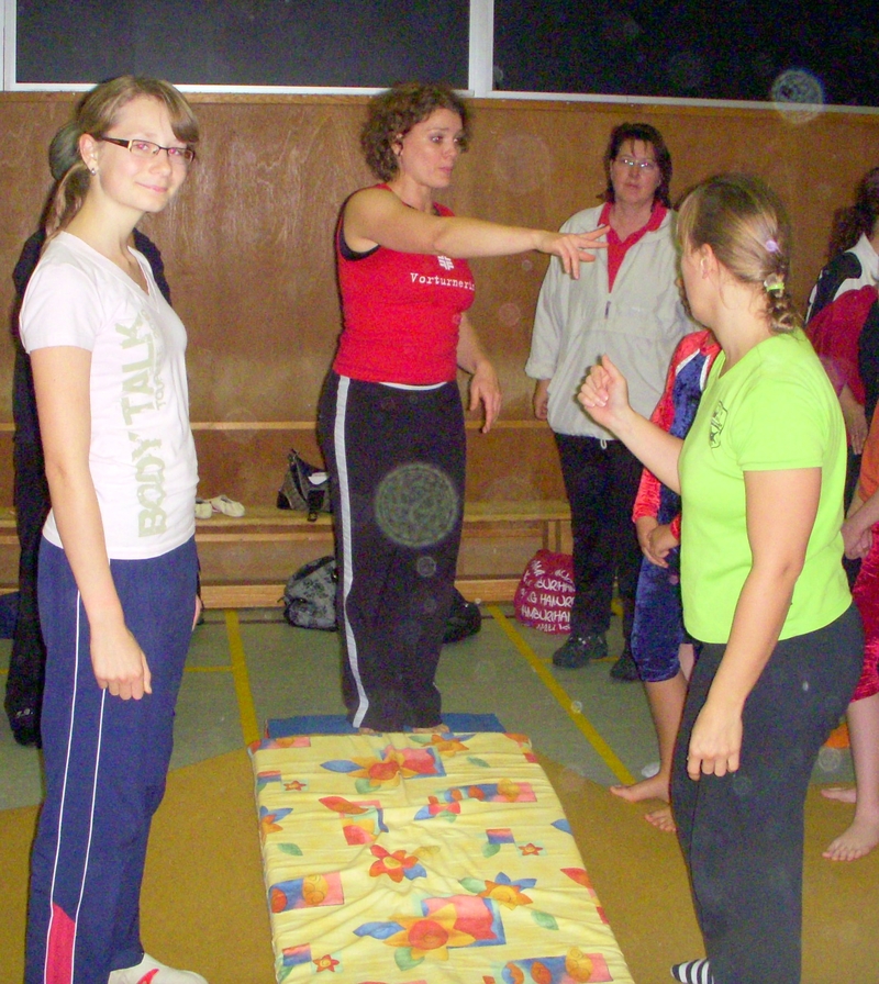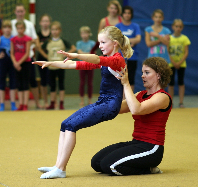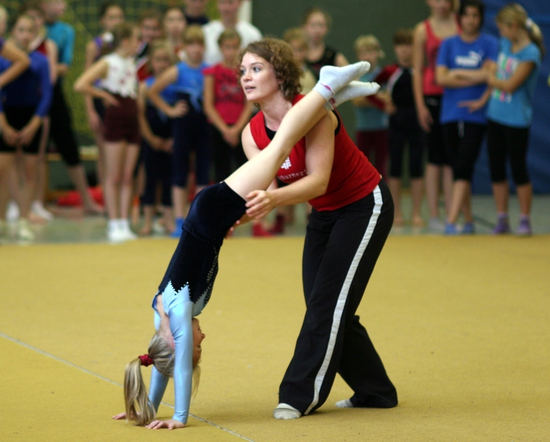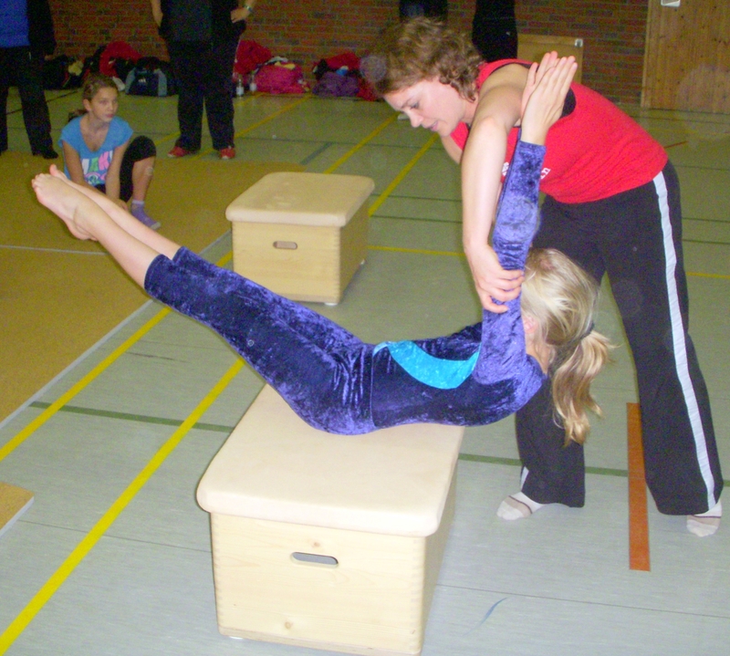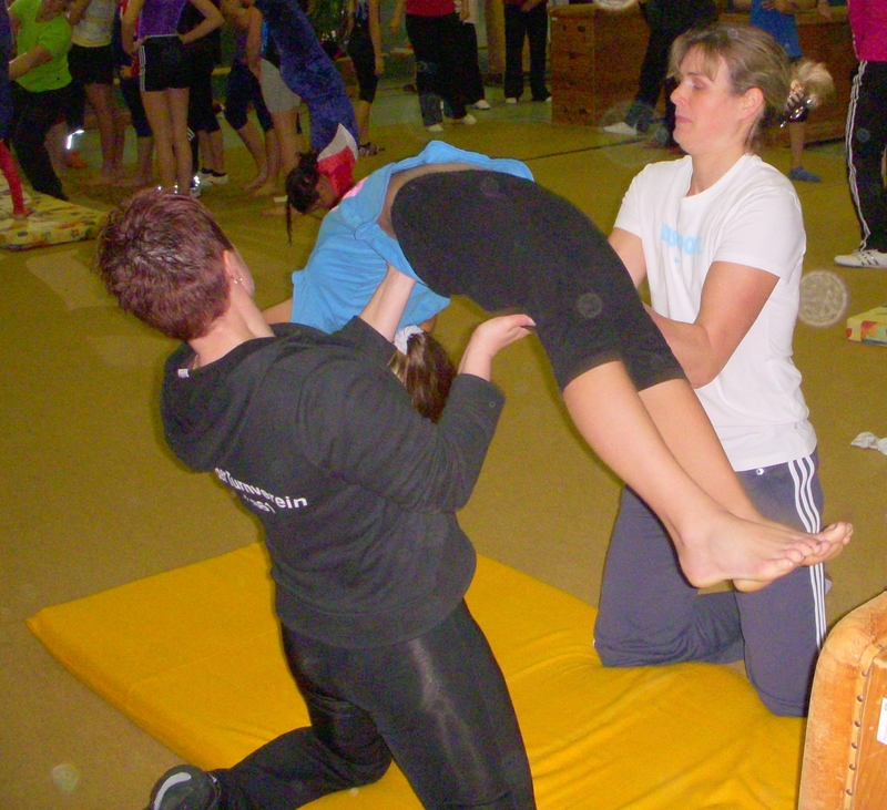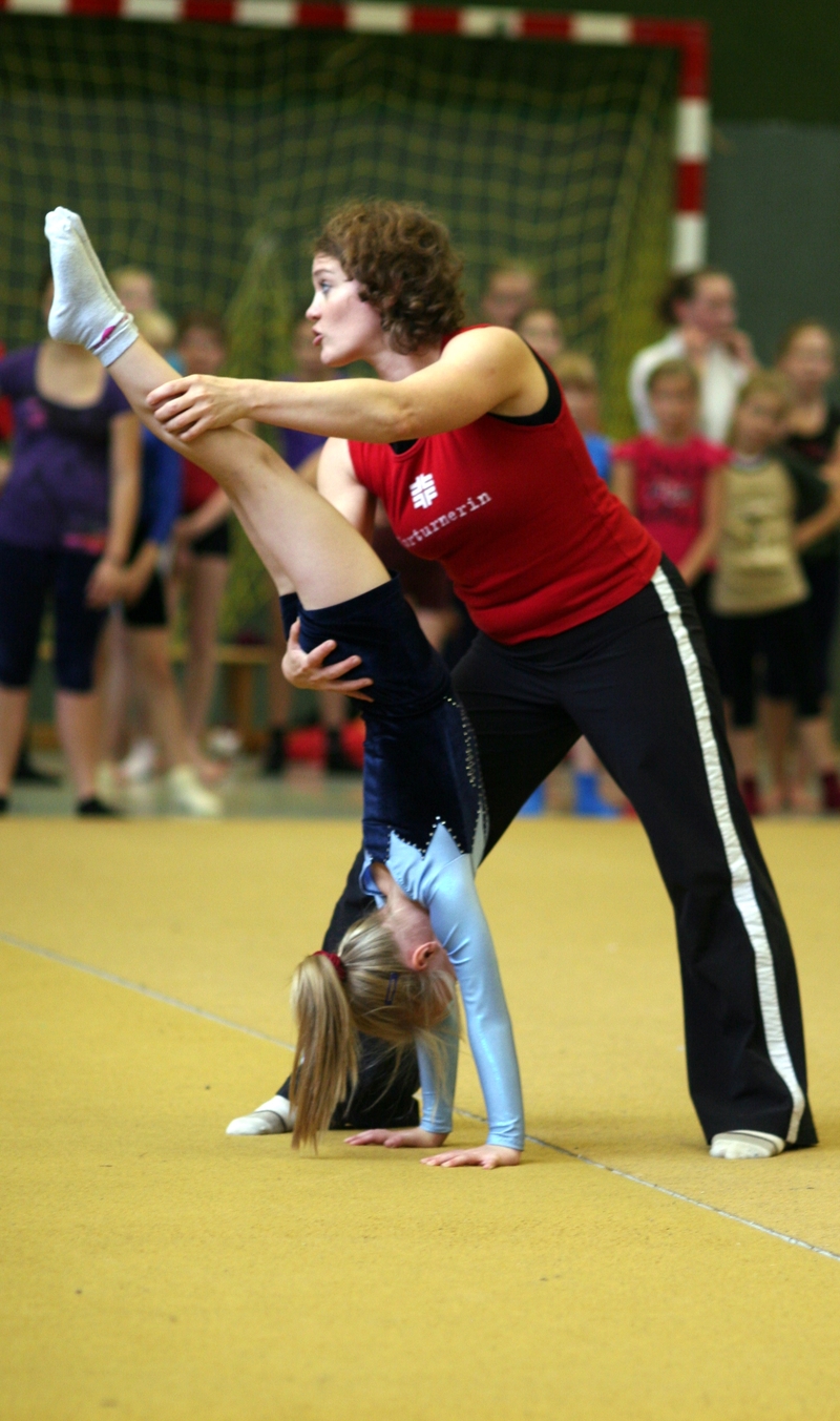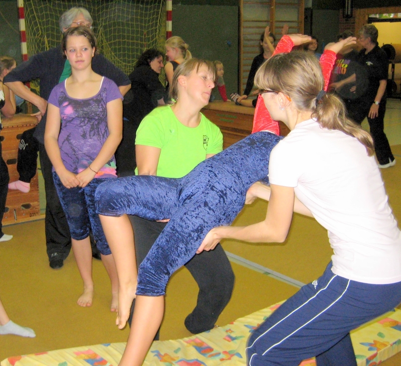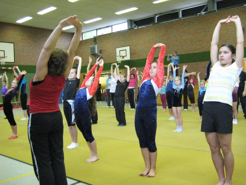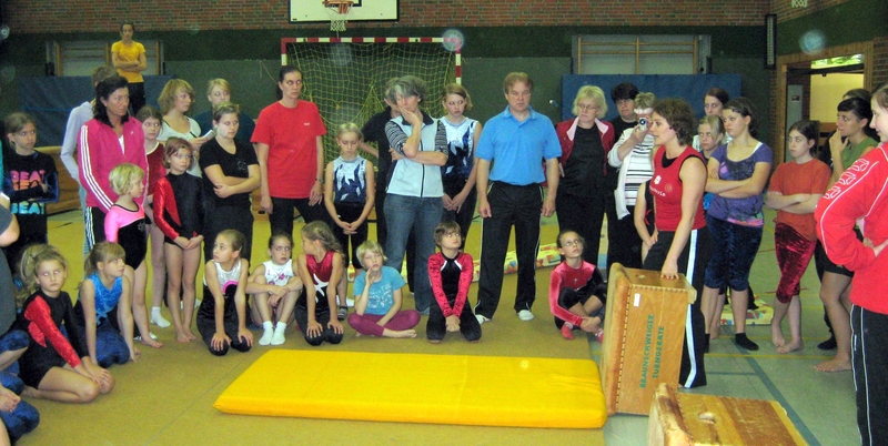 In der kleinen Turnhalle der VGS Glarum brannte die Luft. Mehr als vierzig TrainerInnen und ÜbungsleiterInnen (Gerätturnen) aus dem nahen und fernen Umfeld, zum Teil aus Bremer und emsländischen Vereinen, sowie 35 Turnerinnen konnten am vergangenen Sonnabend wieder einmal mit großer Begeisterung eine Fortbildungsmaßnahme der besonderen Art erleben. Die ehemalige Kunstturnerin und Teilnehmerin an den Olympischen Spielen 1988 in Seoul, Dagmar Kersten (Oldenburg), war der Einladung des Kreisfachwartes Gerätturnen Reinhard Milter gefolgt und referierte in der bis zum Rand gefüllten Glarumer Turnhalle zum Thema „Handstützüberschlag rückwärts (Flick-Flack)“.