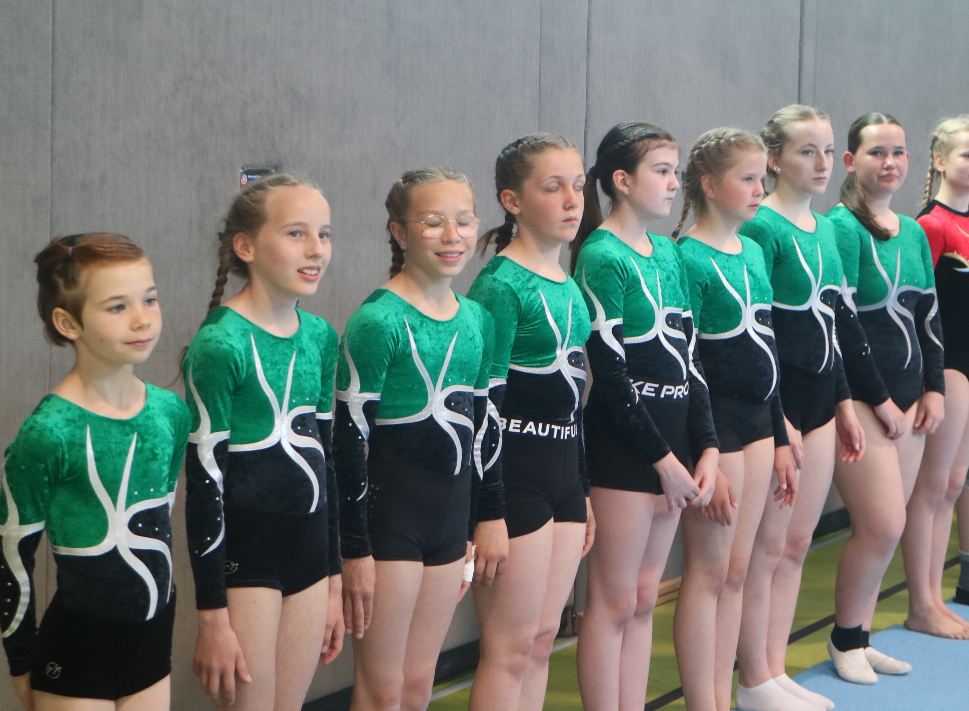 Am Nachmittag gingen die jungen Kürturnerinnen an den Start, für alle war es das erste Mal als Mannschaft in der Kür. Hoch motiviert, aber aufgeregt wie selten traten Teelke Oletti, Paula Schlage, Lotta Janßen, Johanna Janßen, Levke Janssen, Amy Stemmer und Jemma Hopp in den Wettstreit gegen Teams aus Oestringen, Emden, Werlte und Huntlosen. Auch hier war der Zitterbalken das ausschlaggebende Gerät, das am Ende nur für Rang 5 sorgte.