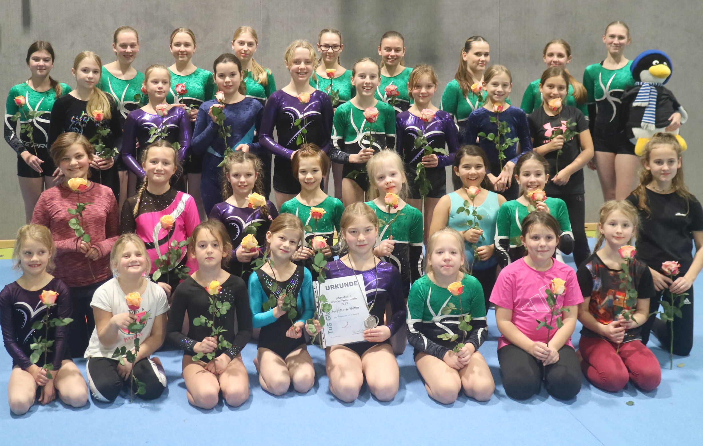 Die Kulisse der Veranstaltung wurde von Steffi Müller (Mutter von Zoey- Marie) genutzt, um der Turngruppe ein Maskottchen in Form eines Pinguins zu übergeben, das natürlich bei Reisen zu Wettkämpfen mit von der Partie ist um für das nötige Tagesglück zu sorgen. Die Freude unter den Turnerinnen war riesig und nun wird ein passender Name für das neue Teammitglied gesucht.