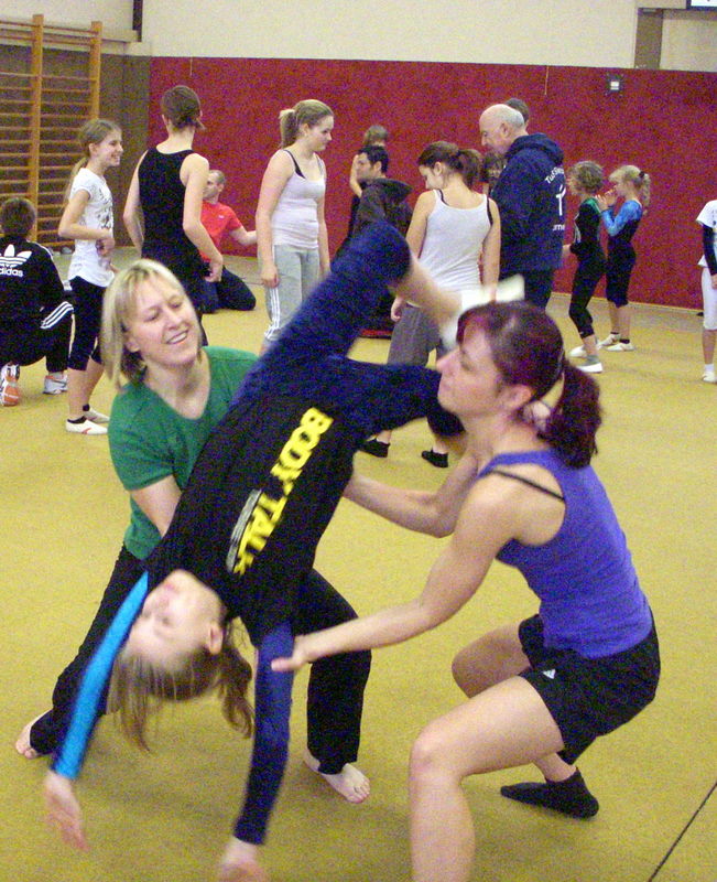Die Trainer Lydia Huber, Anja Müller und Reinhard Milter nahmen mit den Turnerinnen Anna-Maria Grimmelt, Marlene Weinstock und Elin Krupa am 22. Januar in Delmenhorst an einem Lehrgang der besonderen Art teil. Der Delmenhorster Turnerbund beschaffte vor kurzem eine Sprungmatte „AIRFLOOR“. Hierbei handelt es sich um eine mit Luft aufgeblasene Bodenmatte mit verbesserter Federwirkung. Schwierige Sprungelemente wie z.B der Handstandüberschlag vorwärts/rückwärts oder Salti können so besser erlernt werden. Es war insgesamt ein harter Tag für unsere Turnerinnen, der am Ende aber wie immer viel gebracht und erfolgreich zur Trainingsentwicklung beigetragen hat.