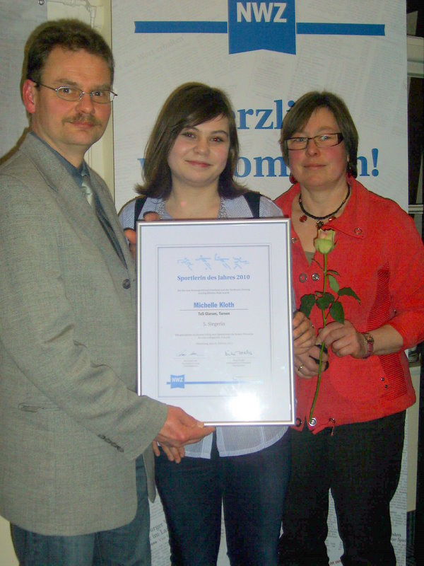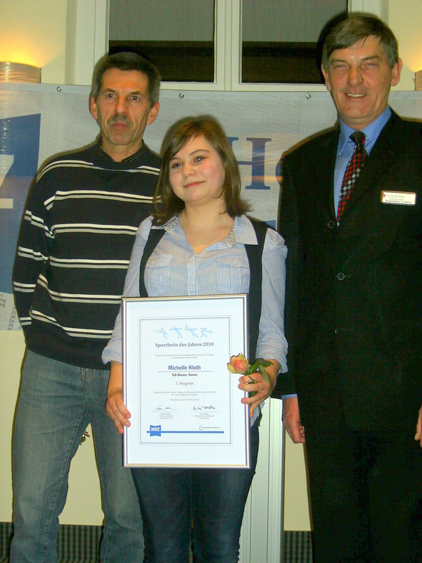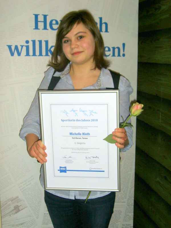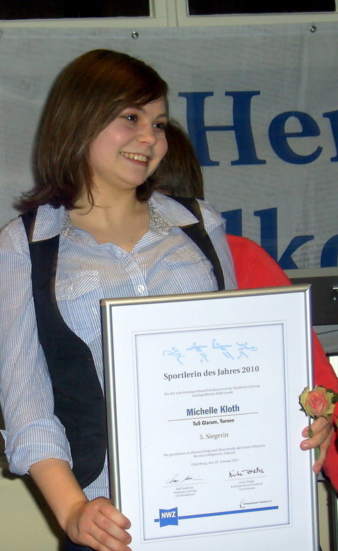 in Obenstrohe die Auszeichnung der Sportlerinnen und Sportler des Jahres 2010 statt. Bei der durch den KSB und die NWZ gemeinsam organisierten und durchgeführten Veranstaltung war unsere Turnerin Michelle im Vorfeld nominiert. Bereits hierüber war der Verein, aber besonders die Turnabteilung hoch erfreut. Voller Spannung wurde dann die Bekanntgabe der Ergebnisse erwartet. Unsere Michelle erreichte Platz 5 und war überglücklich. Sie selbst äußerte ihren Stolz und ihre Zufriedenheit darüber, dass mit dieser Sportlerwahl die Leistungen der Sportler anerkannt und belohnt werden. Wie Recht sie hat – und wir freuen uns mit ihr und gratulieren!!!