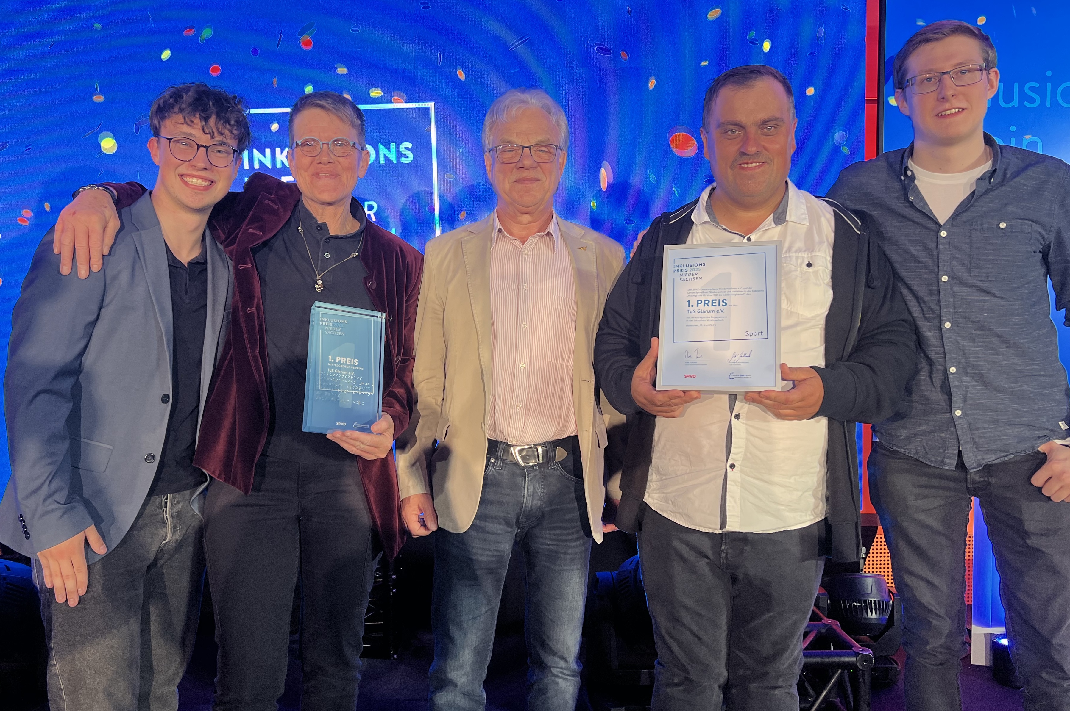 Mit großer Hoffnung im Gepäck reiste das Team des TuS Glarum und der inklusiven Kampfsportgruppe bestehend aus dem Vorsitzenden Reinhard Milter, der Trainerin Jeanette Netzelmann, den Betreuern Christopher Garves und Luca Jauernig sowie dem Gruppenmitglied Waldemar Keterling nach Hannover, denn sie wussten nur dass sie unter den drei Finalisten waren, aber nicht welchen Platz sie genau belegten. Entsprechend groß war die Spannung. aber dann stand fest: im feierlichen Rahmen der Verleihung des Niedersächsischen Inklusionspreises 2025 (Kategorie Sport) wurde der Verein mit dem 1. Platz ausgezeichnet. Überbordender Stolz und große Freude im Team.