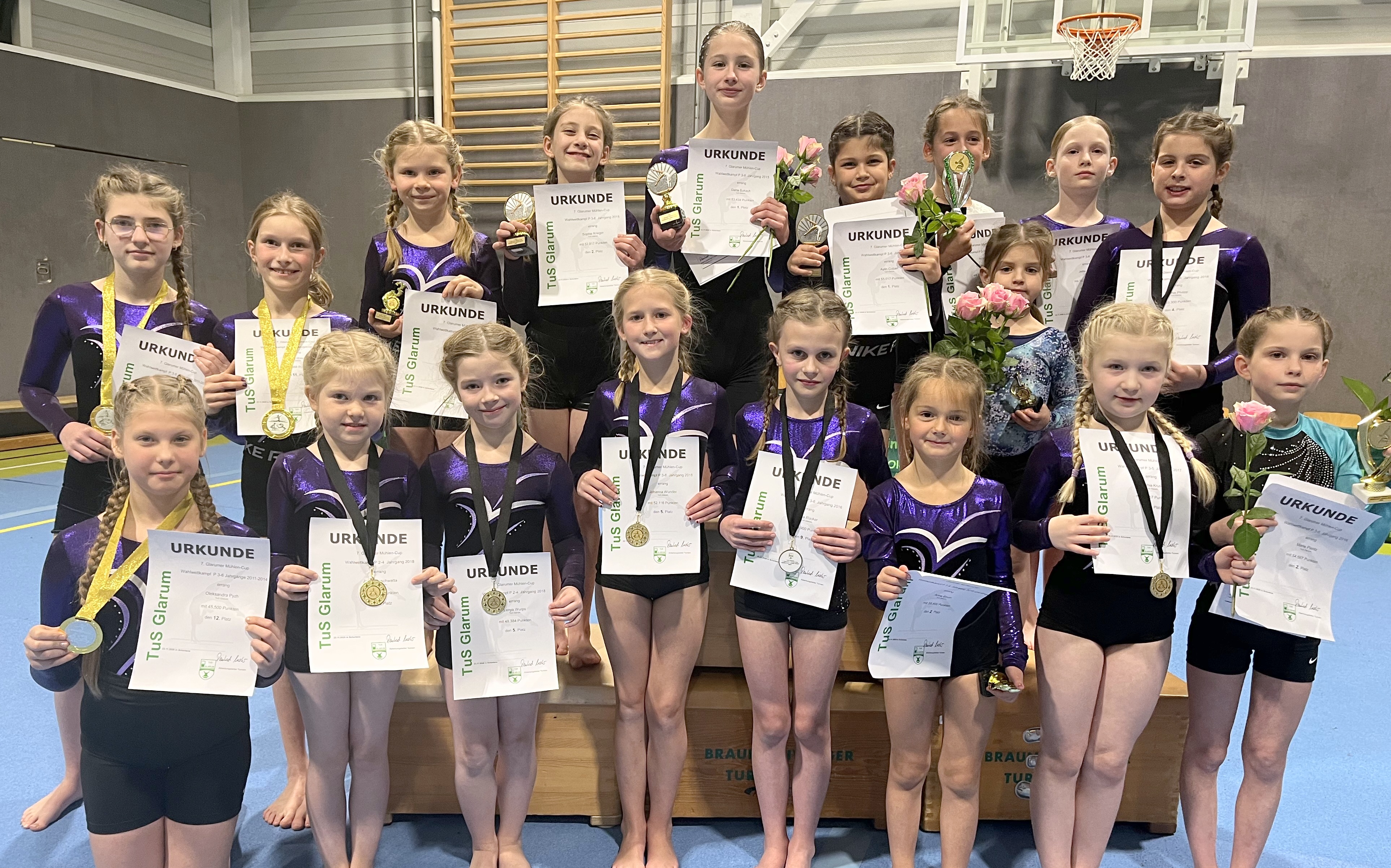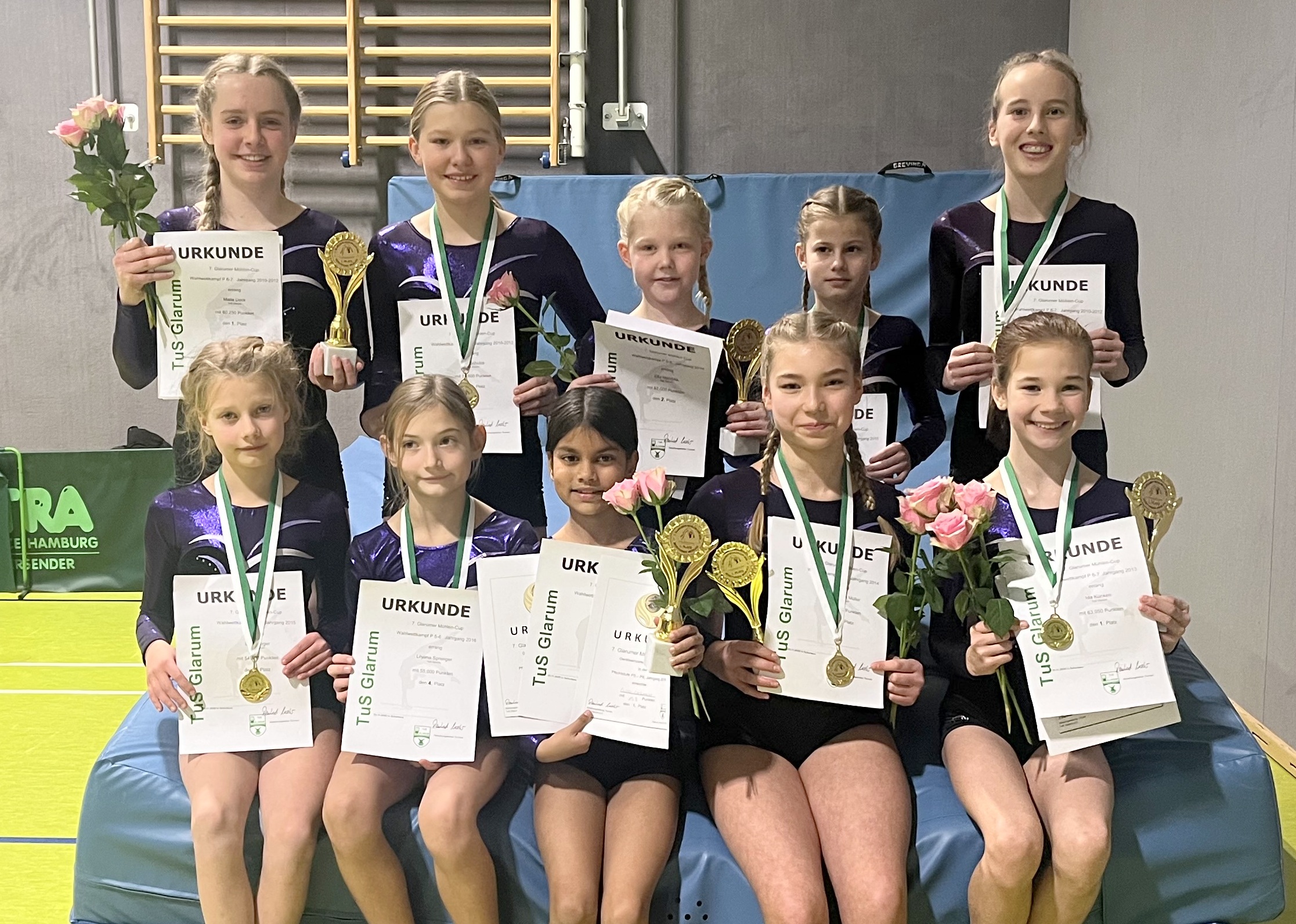Im ersten Durchgang stand neben den Pflichtübungen auch die Kür auf dem Plan. Die Glarumerinnen, aber auch die befreundeten Oestringer Turnerinnen traten in einer kleinen Riege mit vier Turnerinnen zum Wettstreit an. Im Altersband 2008 und älter zeigten die Turnerinnen ihr Können und präsentierten sich den Kampfrichtern. Mit sauber ausgeführten Übungen, beeindruckender Präzision und Eleganz überzeugten die vier Athletinnen. Xenia Schundelmeier (TuS Oestringen) erturnte sich Platz 1, der Silberrang ging an Amke Harms (TuS Glarum). Die Oestringerin Wenke Janßen sicherte sich vor Lena Yersin vom TuS Glarum Rang 3. In der Geräteeinzelwertung gingen die Tagesbestleistungen für Sprung und Boden an Yersin, Janßen war Beste am Balken und Schundelmeier am Barren.